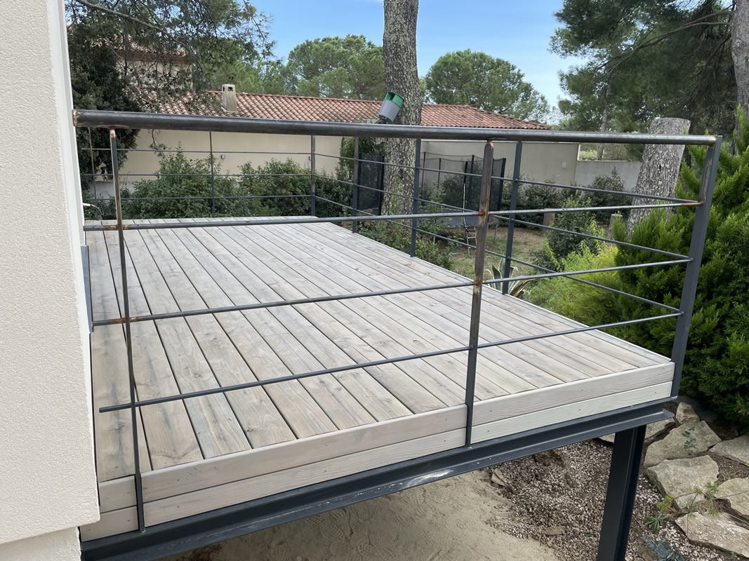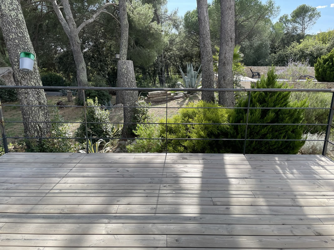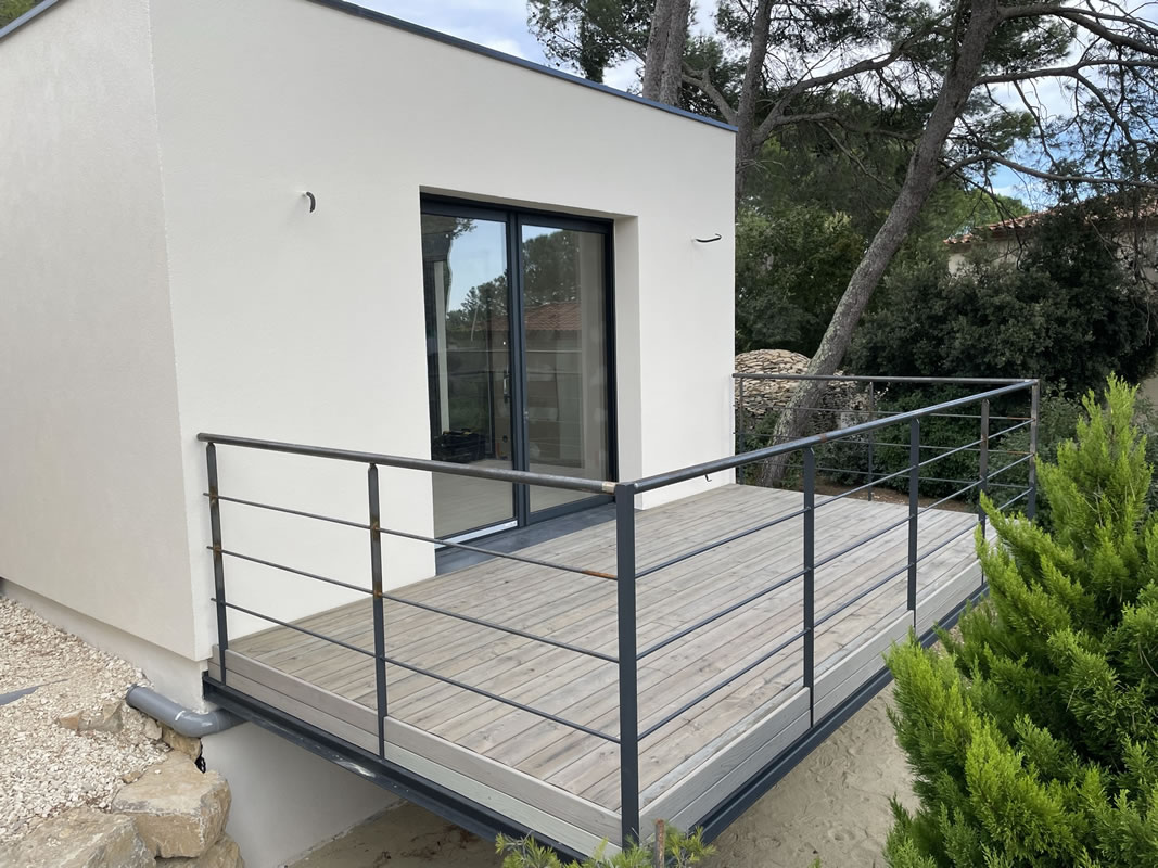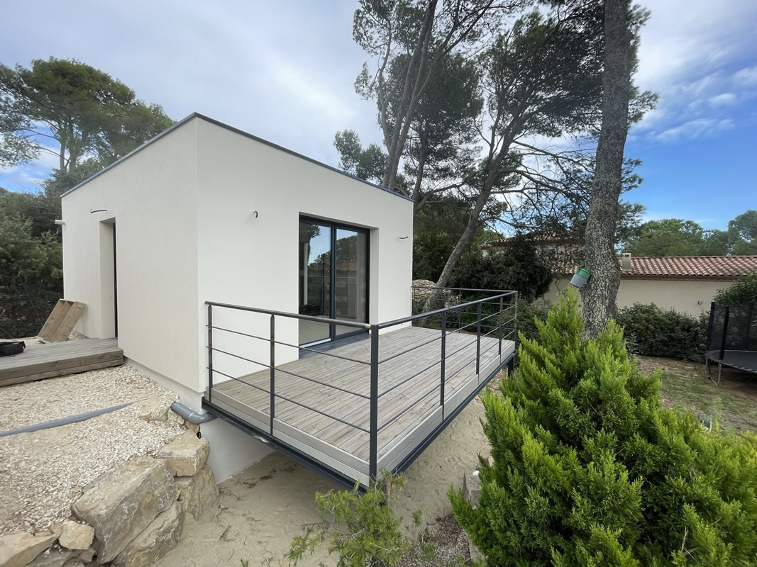 Une terrasse bois sur ossature métallique vient compléter cette construction, une belle indépendance pour de belles vacances.