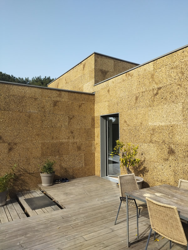Une isolation avec de la ouate de cellulose avec en complément d’isolation un bardage liège extérieur.